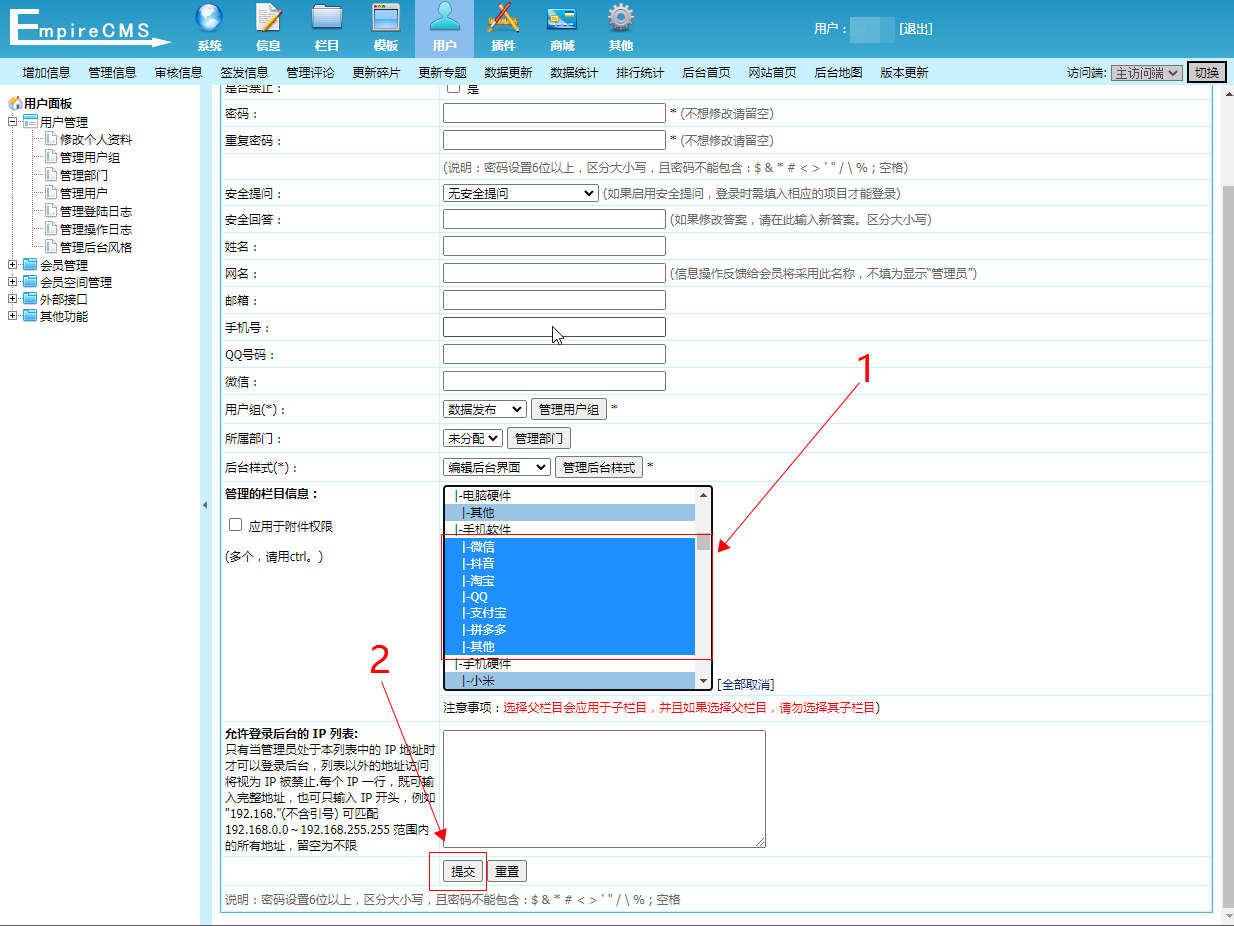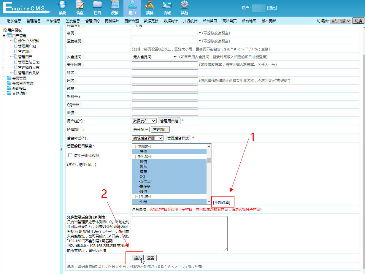 关于帝国cms给用户赋予了栏目权限打开还是提示无权限操作相关问题,可以通过系统后台的用户管理界面,重新设置用户权限即可,以下介绍具体操作过程。