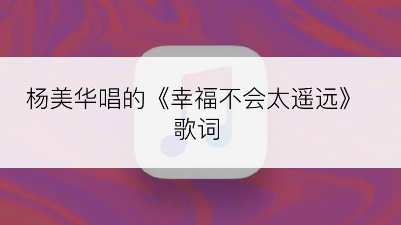 《幸福不会太遥远》 是杨美华演唱的歌曲,时长04分00秒,该歌曲收录在杨美华2018年的专辑《幸福不会太遥远》之中,如果您对这首歌曲歌词比较中意,那我们就一起来学习和分享这首歌曲歌词吧!