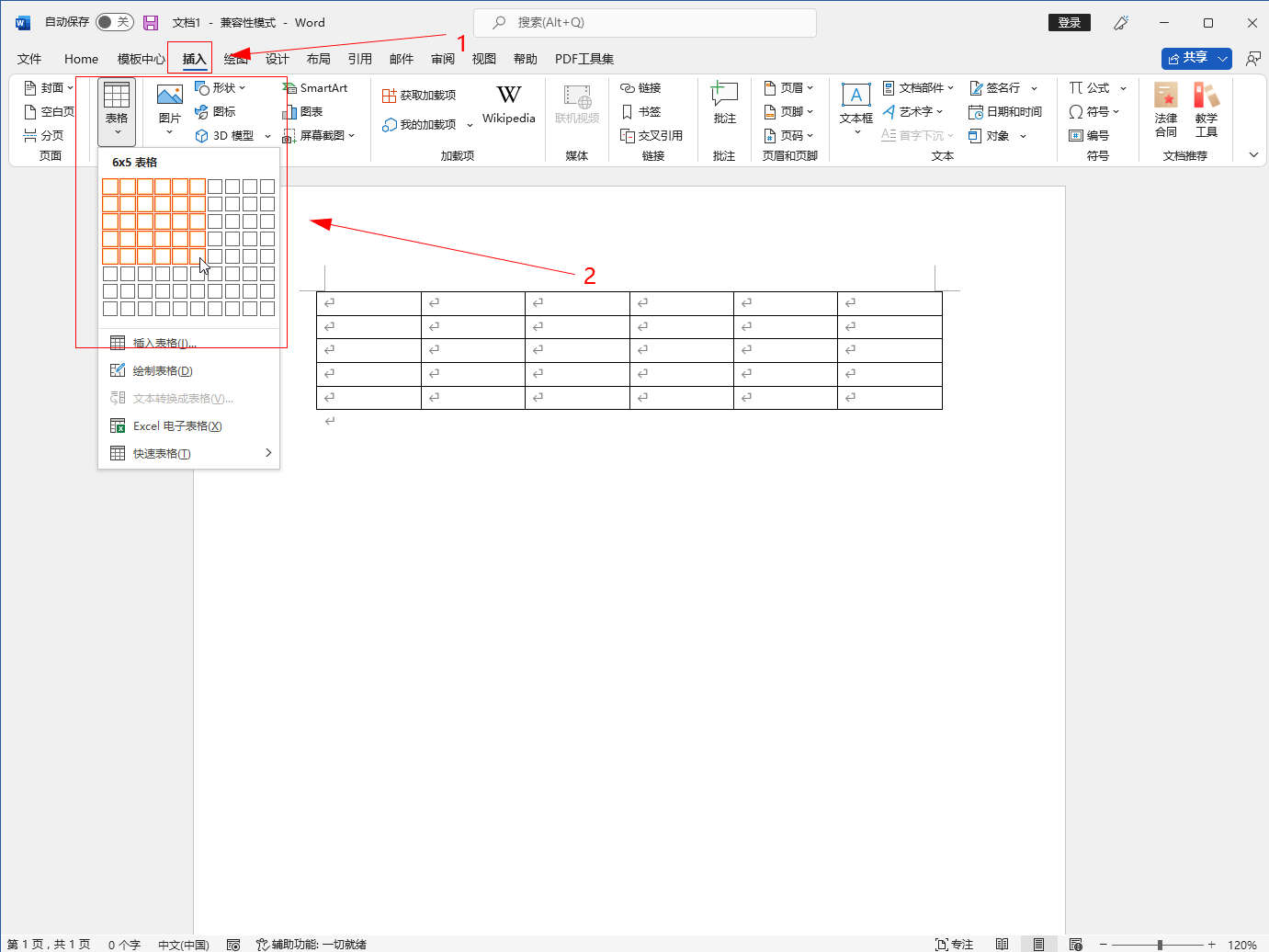 2.选择【插入】菜单,工具栏中点击【表格】按钮,在下拉框中选择表格行和高后单击鼠标左键。