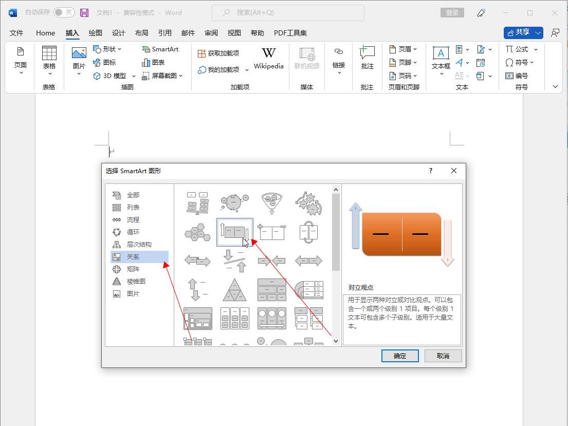 3.在打开的SmartArt图形对话框中,左侧选择【关系】选项,右侧选择【对立关系】图。